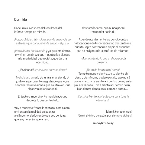 ¡Vas a dormir hasta morir! y yo quisiera dormir, que no ha ignorado lo profuso de mi amor:
